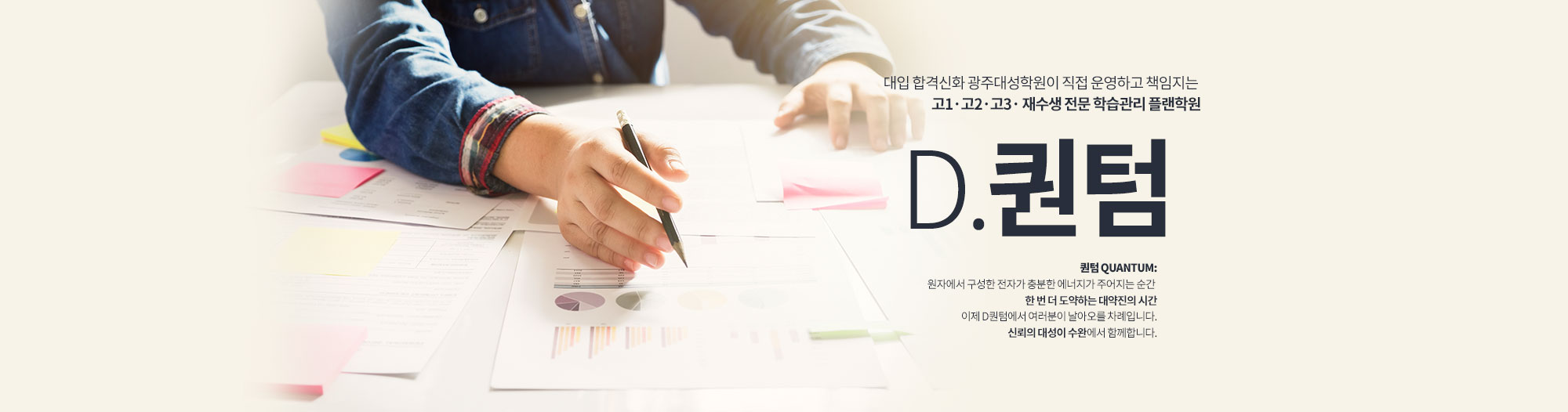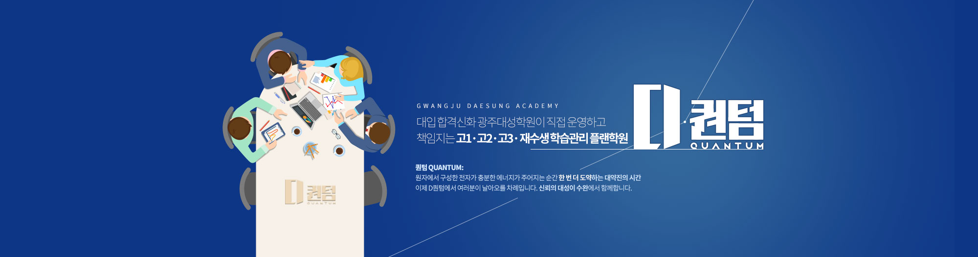 광주대성학원 그리고 D퀀텀. 광주대성이 디퀀텀의 이름으로 당신의 대입성공신화를 시작합니다. 시설안내 - 전국최대 규격 책상과 개인공간 퀀텀 프리미엄 독서실 1인 고정좌석 제공. 넓은 고급책상과 시디즈 의자 대성으로 통한다. 퀀텀으로 채우다. 대성이 만든 수능전문가 집단의 단과전문 퀀텀클래스